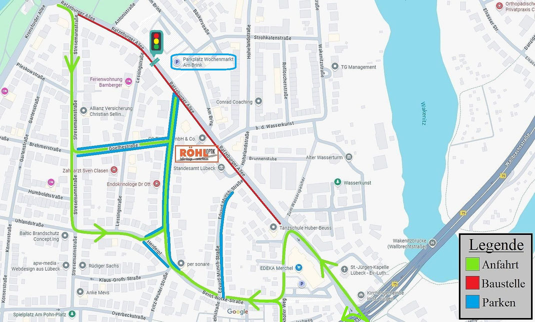 Die Querung der Ratzeburger Allee ist aktuell nur auf höhe EDEKA über 3 Ampeln, am Brink über die Ersatzampel, oder über den Mühlentorteller möglich.